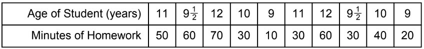 The table shows the ages of ten students and the number of minutes of homework they had last night.