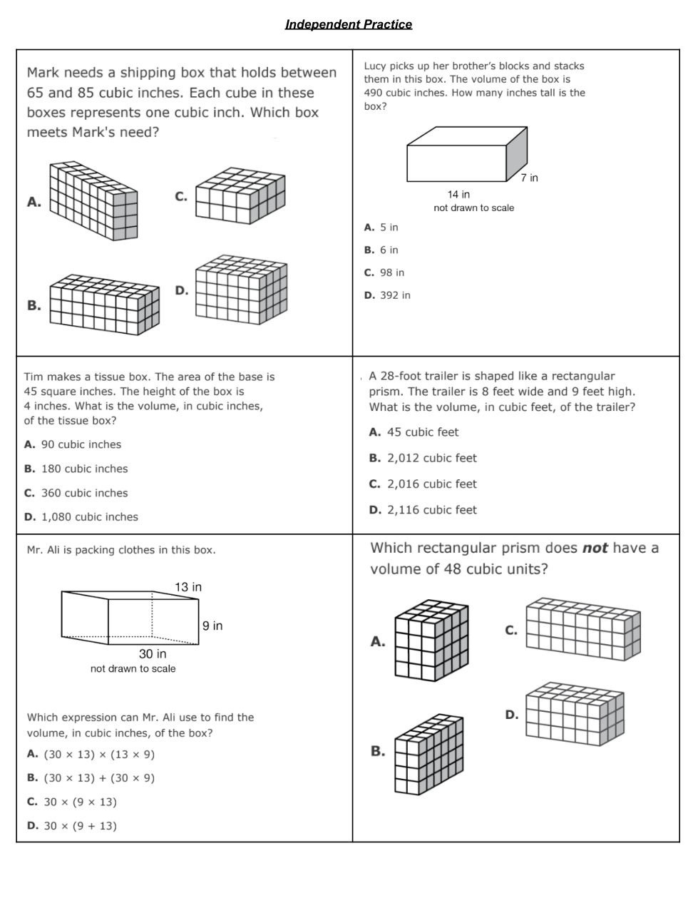 Mark needs a shipping box that holds between 65 and 85 cubic inches. Each cube in these boxes represents one cubic inch. Which box meets Mark's need?