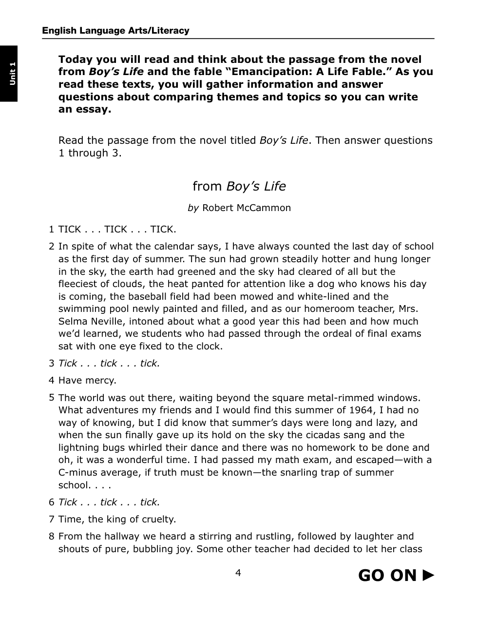 You have read the passage from Boy’s Life and “Emancipation: A Life Fable.” Write an essay that identifies a similar theme in each text and compares and contrasts the approaches each text uses to develop this theme. Be sure to support your response with evidence from both texts.