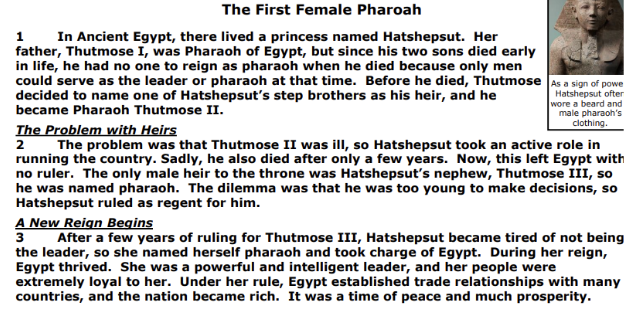 What text feature did the author include to provide information about how Hatshepsut tried to show she was a strong leader?