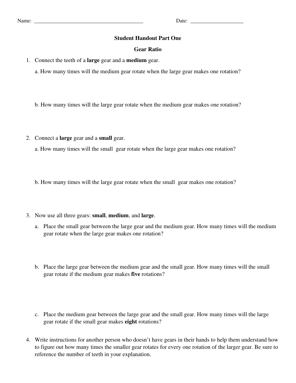 Write instructions for another person who doesn’t have gears in their hands to help them understand how to figure out how many times the smaller gear rotates for every one rotation of the larger gear. Be sure to reference the number of teeth in your explanation.
