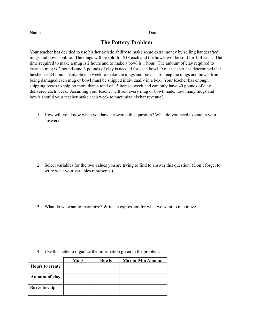 The max or min amounts lead to constraints on how many mugs and bowls can be made. We write these constraints as inequalities. Write an inequality using the fact that only 15 boxes are available for shipping.