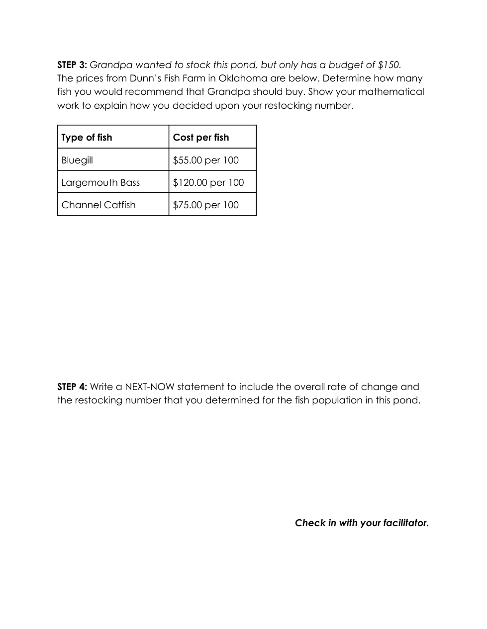 Grandpa wanted to stock this pond, but only has a budget of $150. The prices from Dunn’s Fish Farm in Oklahoma are below. Determine how many fish you would recommend that Grandpa should buy.