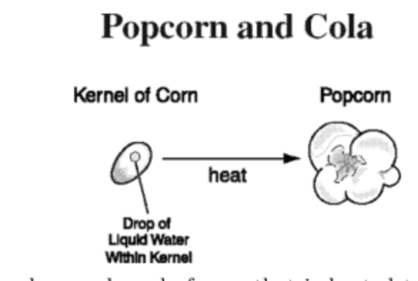 A popcorn kernel is up to 13% water. The drawing above shows a kernel of corn that is heated until it pops. Which of the following best explains what happens to the liquid water stored inside the kernel that leads to the popping process?
