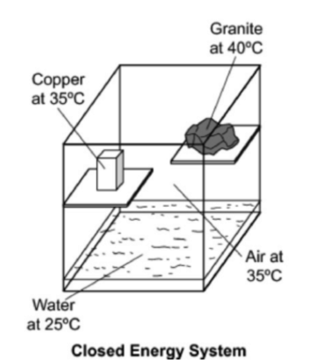 The diagram shown represents a closed energy system. The system contains equal masses of air, copper, and water in a perfectly insulated container. The temperatures were taken at the time the materials were placed in the closed system.