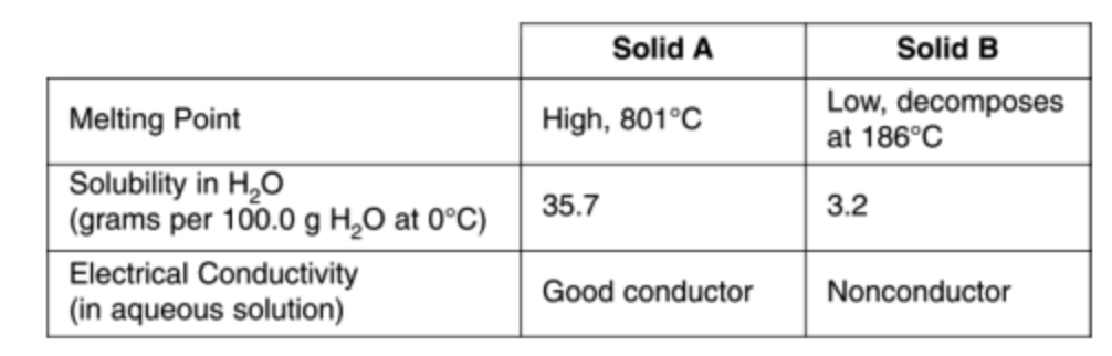 A chemist performs the same tests on two homogeneous white crystalline solids, A and B. The results are shown in the accompanying table.