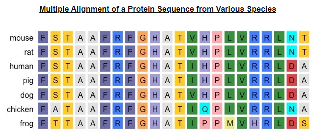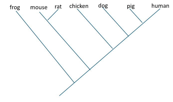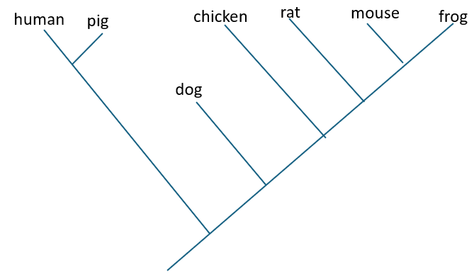 Based on the amino acid sequences in the organisms below in comparison to a human, which is the best representation of a cladogram illustrating their relatedness?