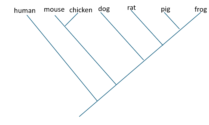 The cladogram below shows the phylogeny of seven animals. Which two animals are the most closely related?