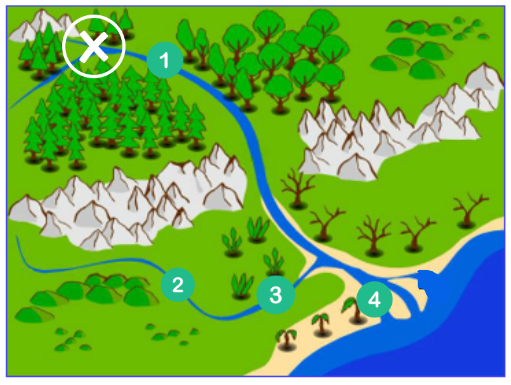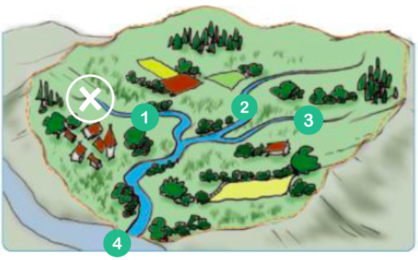 Dans l'image ci-dessous, une usine située au point X déverse ses eaux usées dans le cours d'eau qui passe tout près. Quel(s) endroit(s), parmi 1, 2, 3 et 4, va subir les impacts de cette contamination ?