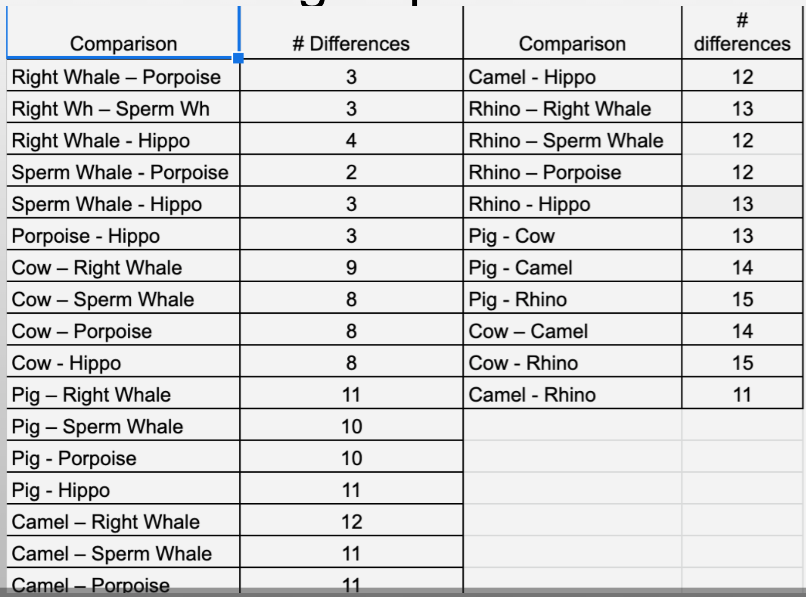 Based on this data, the __________ is the most closely related land mammal to the cetaceans because the __________ has only __________ DNA differences between itself and the 3 cetaceans.