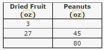 Ms. Carey is planning to host a neighborhood picnic. To make sure she had enough ingredients, she was making a table of possible combinations of dried fruit to peanuts for her terrific trail mix. The table shows the original recipe’s ratio of dried fruit to peanuts.