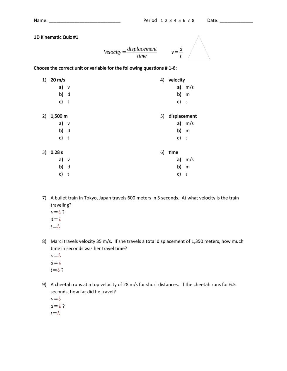Copy of Velocity Problems Quiz 1 Reg (6/7/2024)