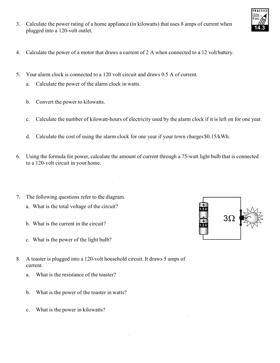 Your alarm clock is connected to a 120 volt circuit and draws 0.5 A of current.