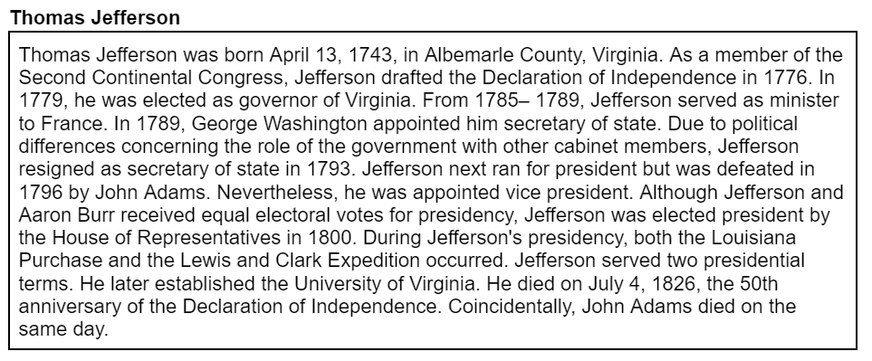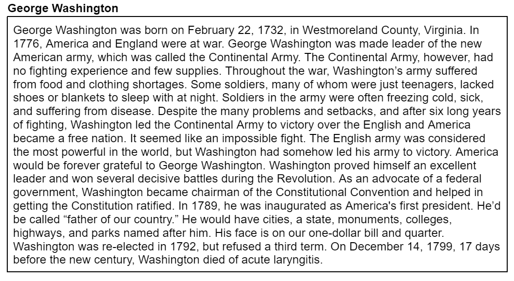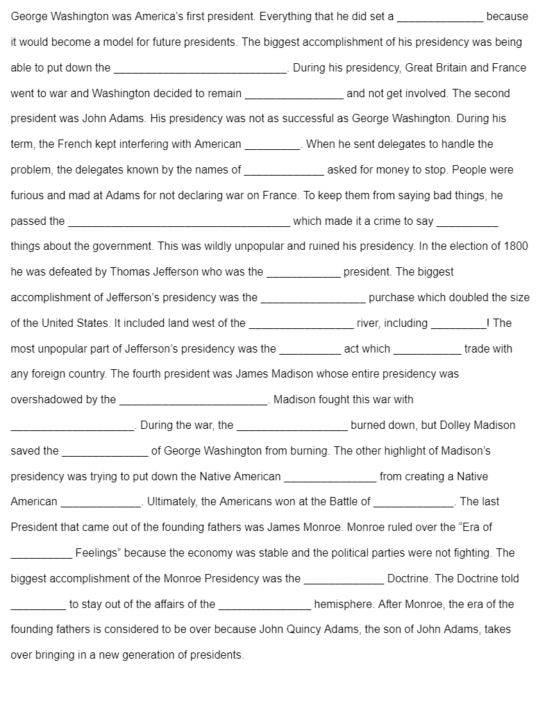 Read through the short summary of America's first five presidents below. Fill in the blanks with the correct responses