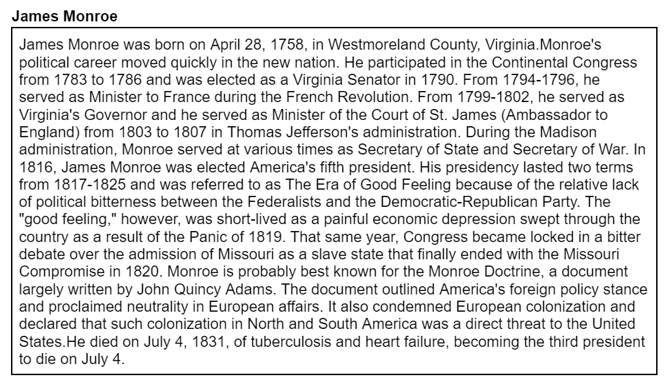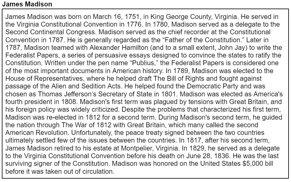Madison | arrow_right_alt | the War of 1812 was fought during his term |