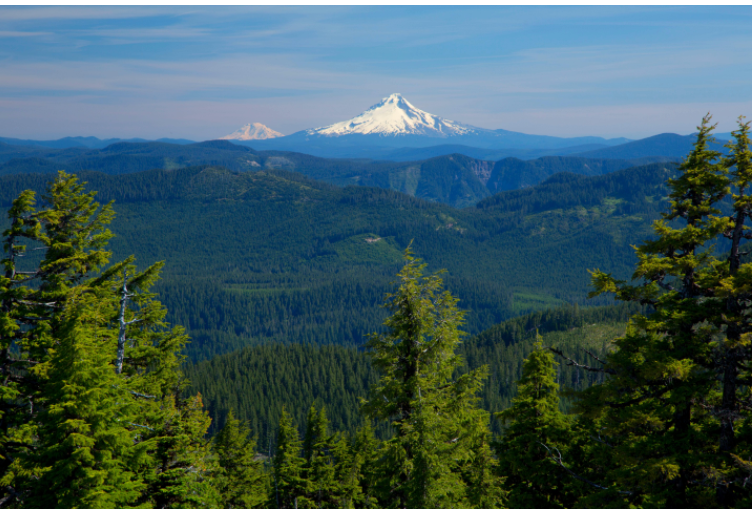 This image was taken from a satellite that is looking down on the Cascade Mountain Range and Mount Hood from above.