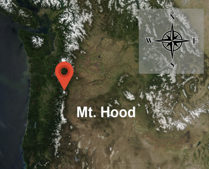 Using the pictures above: Looking at the location of Mt. Hood on the satellite image, which side of Mt. Hood were the two pictures above taken from?