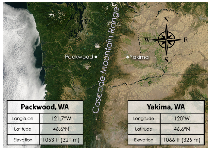 How different can climate conditions be on either side of a mountain? Let’s look at the data for two towns that are on either side of the Cascade Mountain Range.
