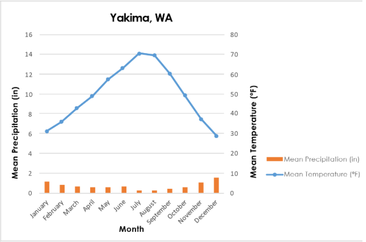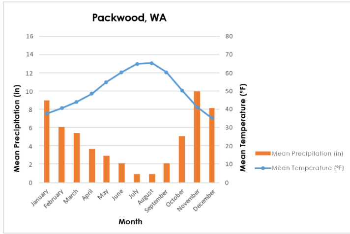 The bar graphs below show the mean monthly temperature and precipitation over the course of one year for Packwood and Yakima.