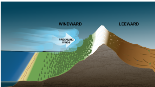 The side of the mountain range facing the prevailing wind is called the windward side. The side facing away from the prevailing wind is the leeward side.