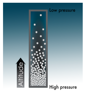 At lower levels in the atmosphere, the air pressure is greater because more molecules in the air press down from above.