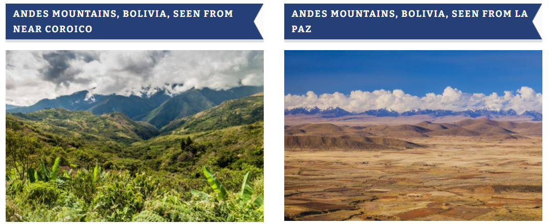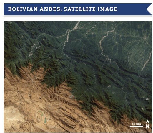 Another example of a rain shadow effect. This mountain is in the Andes Mountains in Bolivia in South America. Look at the satelite image of the same place below.