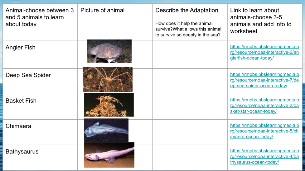 Watch this clip to learn about the Bathysaurus: https://rmpbs.pbslearningmedia.org/resource/noaa-interactive-4/bathysaurus-ocean-today/List the adaptation and how it helps survival of this marine creature.