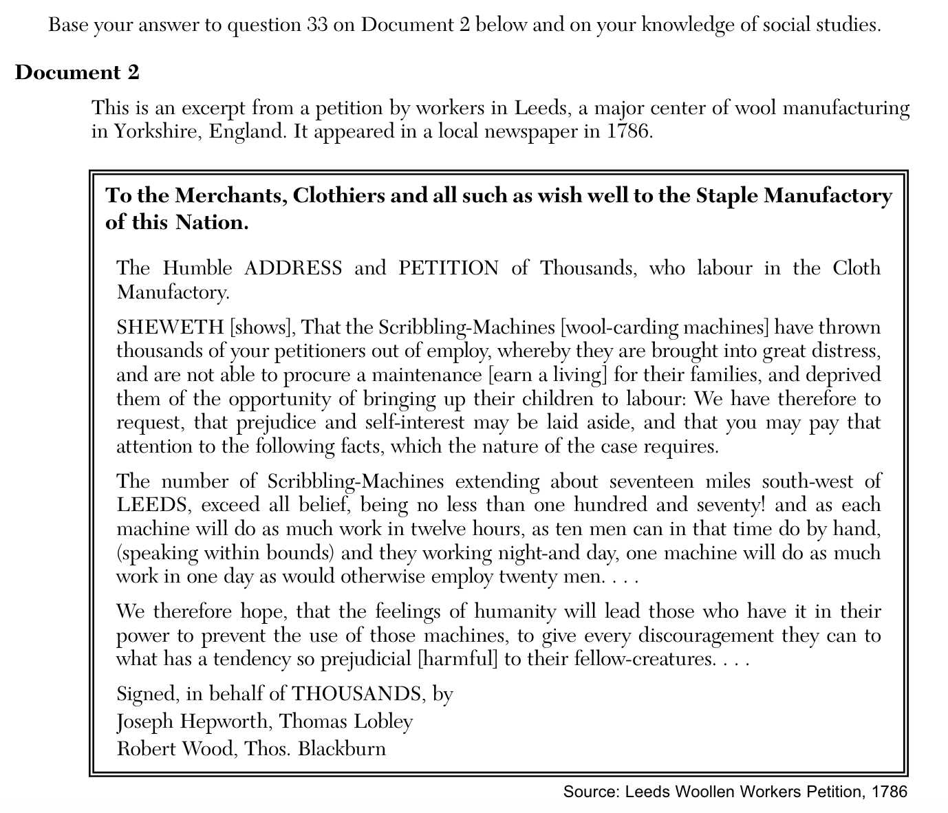Based on this excerpt, explain the purpose of the 1786 petition written by Woollen Workers in Leeds, England.