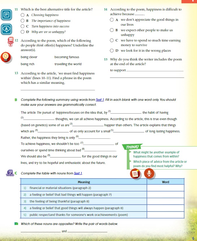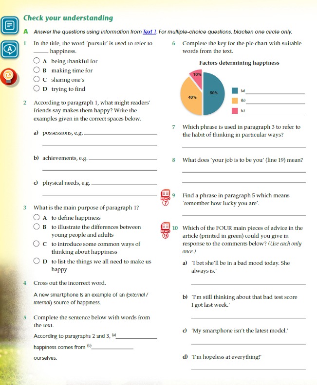According to paragraphs 2 and 3, _______ happiness comes from _______ ourselves.