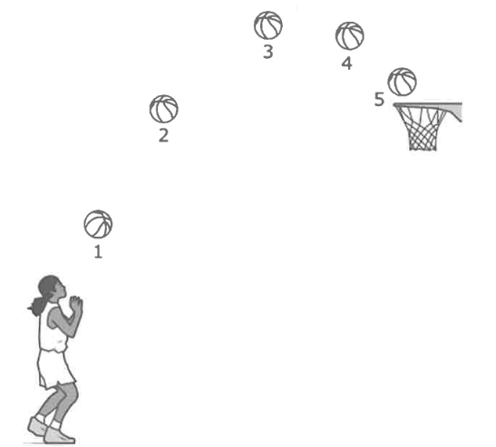 After playing basketball, two students draw a diagram of the basketball's motion when being thrown toward the basket. In the diagram shown, the ball is at its highest point at position 3.