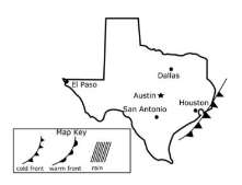 Before the front passed through Houston on Sunday, the high temperature was 57 degrees Fahrenheit. Which of the following is the most reasonable prediction for the high temperature on Monday, after the front has passed?