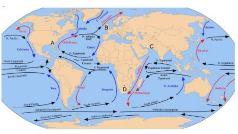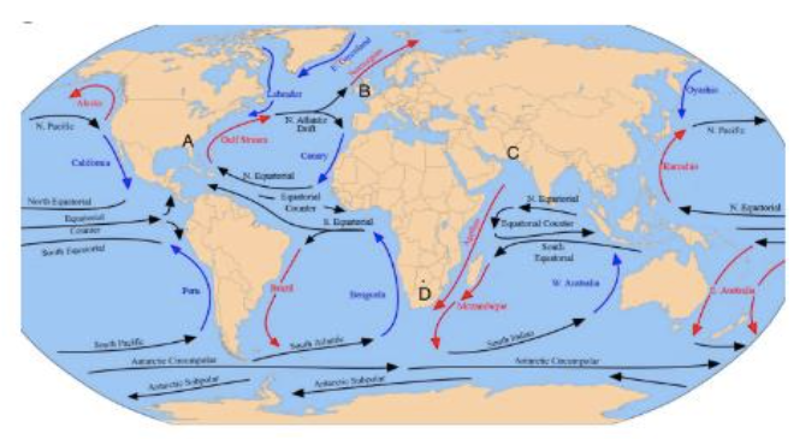 The diagram below shows the flow of ocean currents across the globe. Use the map to answer the following question.