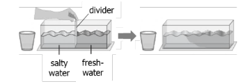 A teacher creates a model of ocean currents. The teacher pours salt water with blue dye on one side of a container and freshwater with green dye on the other side. Next, the teacher carefully removes the divider, and the students observe what occurs, as shown.