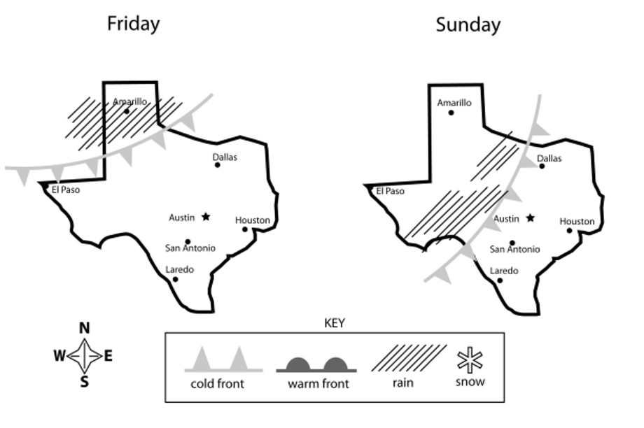 Which city on the map had rain on Friday which had cleared by Sunday?