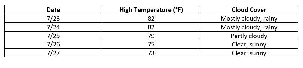 The table shows some weather data collected over a five day period.