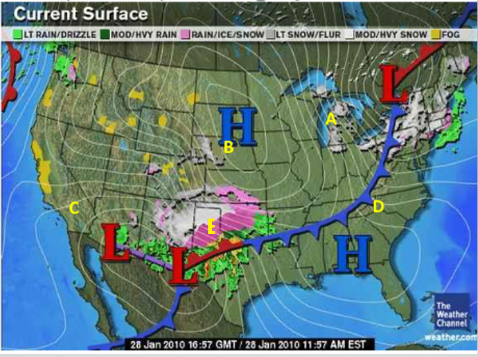 What type of weather would likely be happening in northern Texas at letter E?