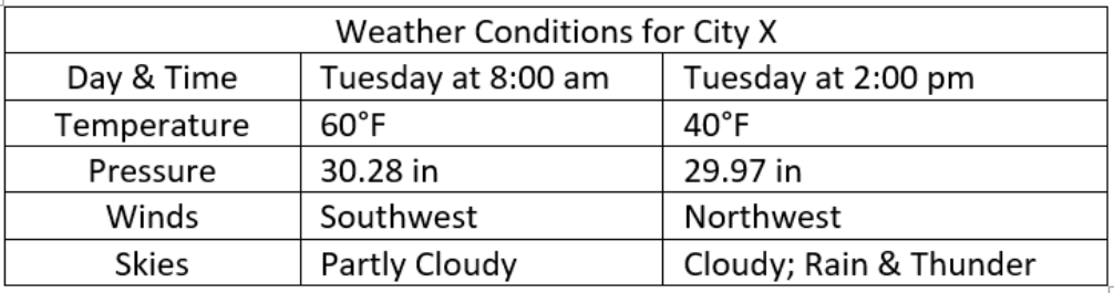 Which combination of barometric pressure and temperature would most likely predict a thunderstorm?