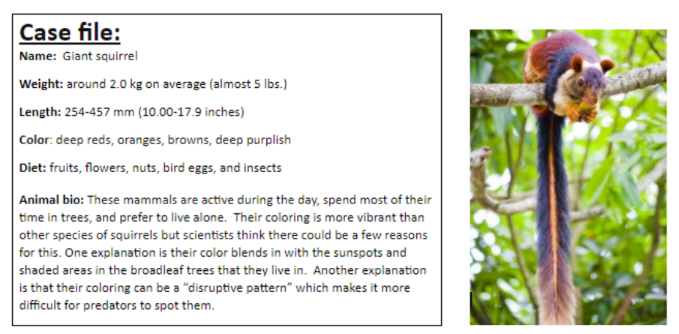 Based on the case file and photograph provided, we can infer that the Giant squirrel is found in a forest biome. Which TWO arguments best support that the tropical rainforest would be the most likely forest biome that the Giant squirrel lives in instead of a coniferous forest biome?
