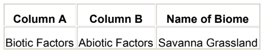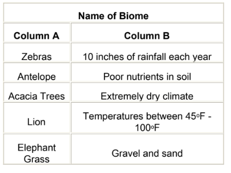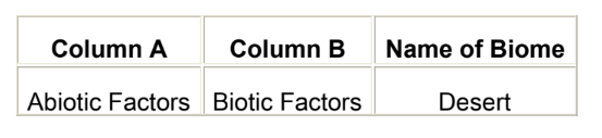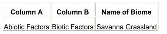 The table below lists abiotic and biotic factors of a particular biome.
