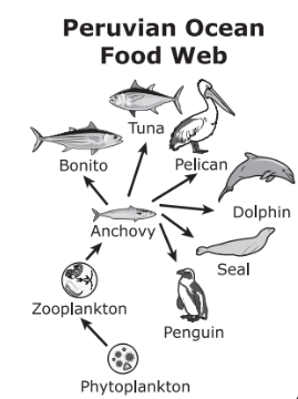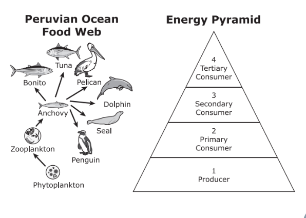 According to the food web, in which trophic level of the energy pyramid does the anchovy belong?