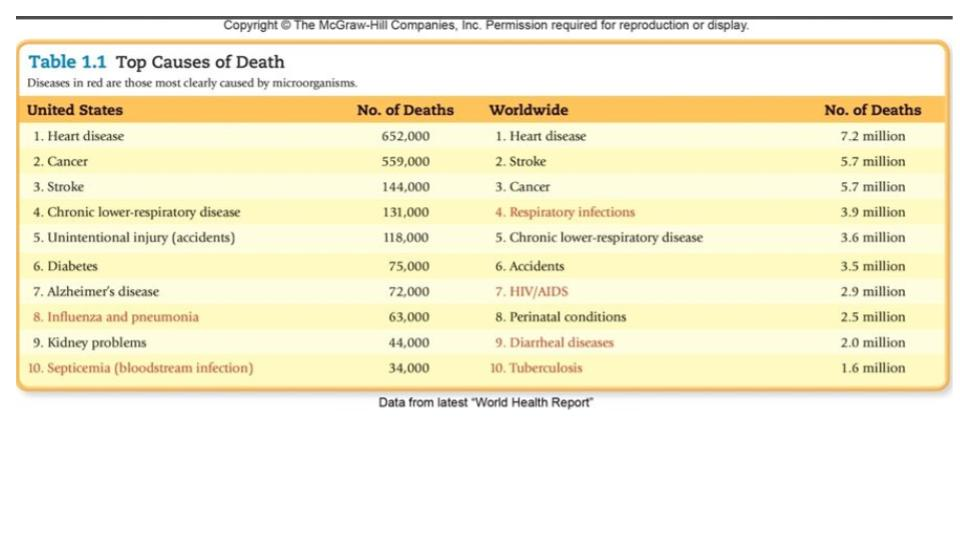 This chart from chapter one identified diseases most clearly caused by microorganisms/viruses.