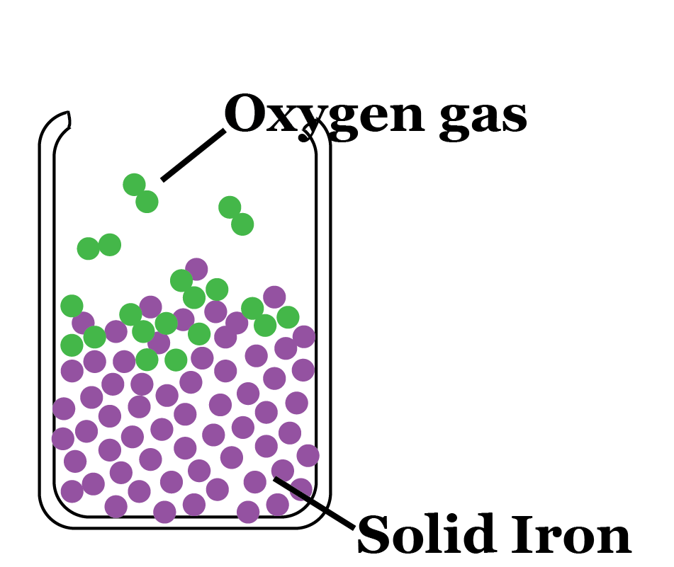 Use the drawing tools to draw particle diagrams to show how the iron and oxygen atoms are arranged in each substance. Be sure to use different colors for each element.