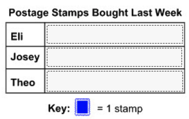 Drag stamps into the picture graph to show the number of postage stamps each person bought last week.