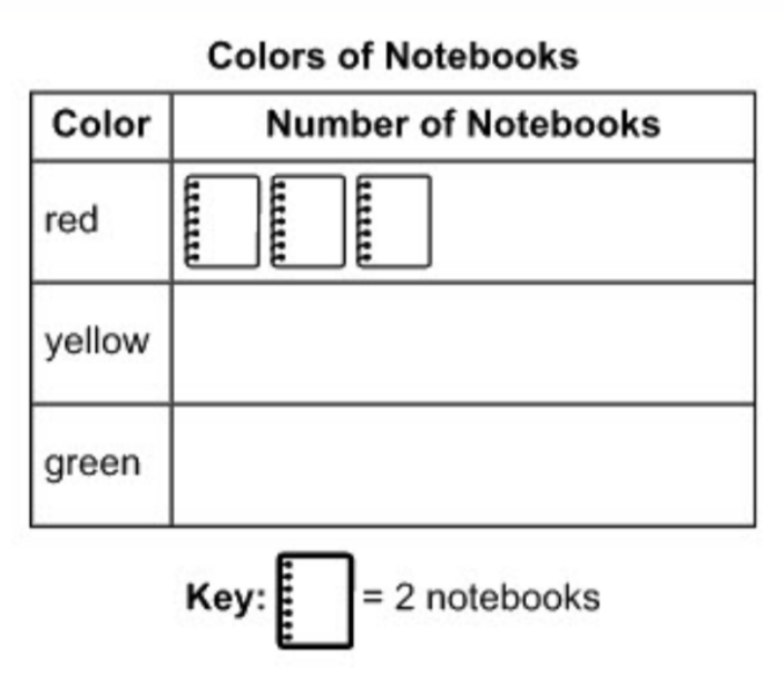 A store owner counts the numbers of notebooks of different colors for sale. There are 4 more red notebooks than yellow notebooks. There are 2 more green notebooks than yellow notebooks. Drag notebooks into the yellow and green rows to complete the picture graph.