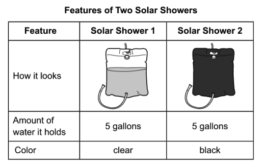 A solar shower is a device that people use to take showers outside. The device includes a bag and a hose with a spout. Two solar showers are filled with water and placed outside in direct sunlight. A student records the time needed for the temperature of the water in the two solar showers to increase.