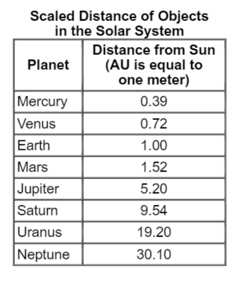 A student is building a scale model of the solar system. The table below shows the distance between the Sun and each planet in our solar system. In the student's model, one astronomical unit (AU) is equal to one meter.