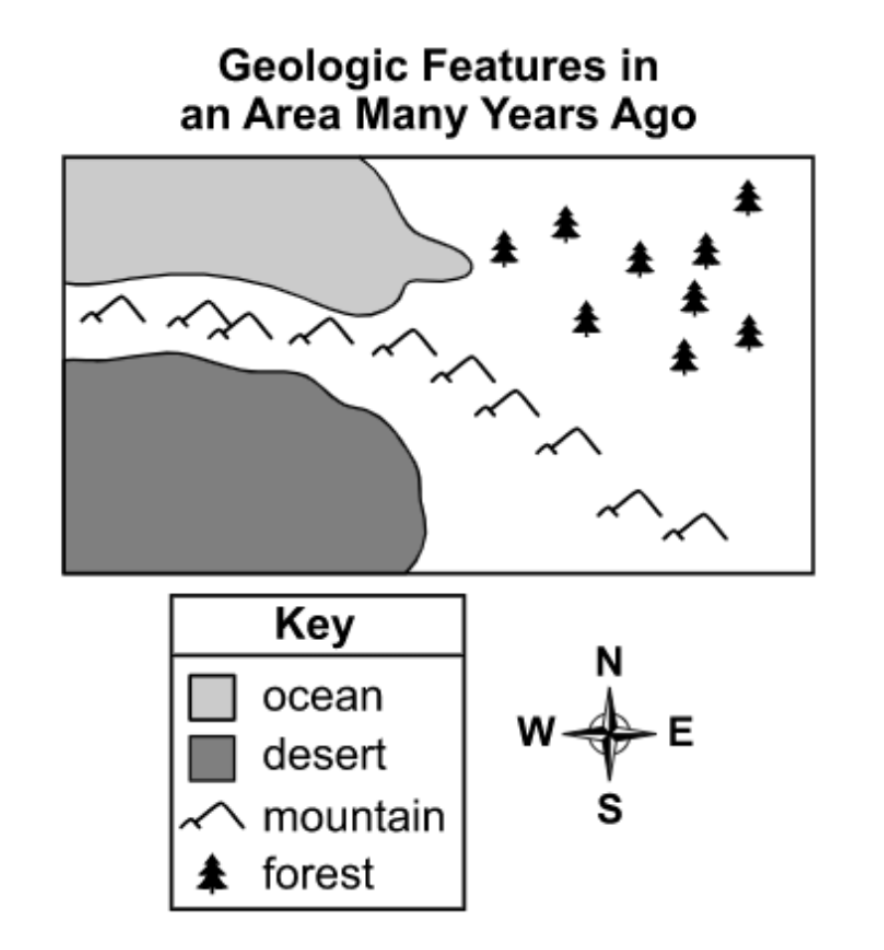 Coal forms over time from the remains of plants. Oil forms from the remains of tiny organisms that live in salt water. The map shows some of the geologic features in an area many years ago.