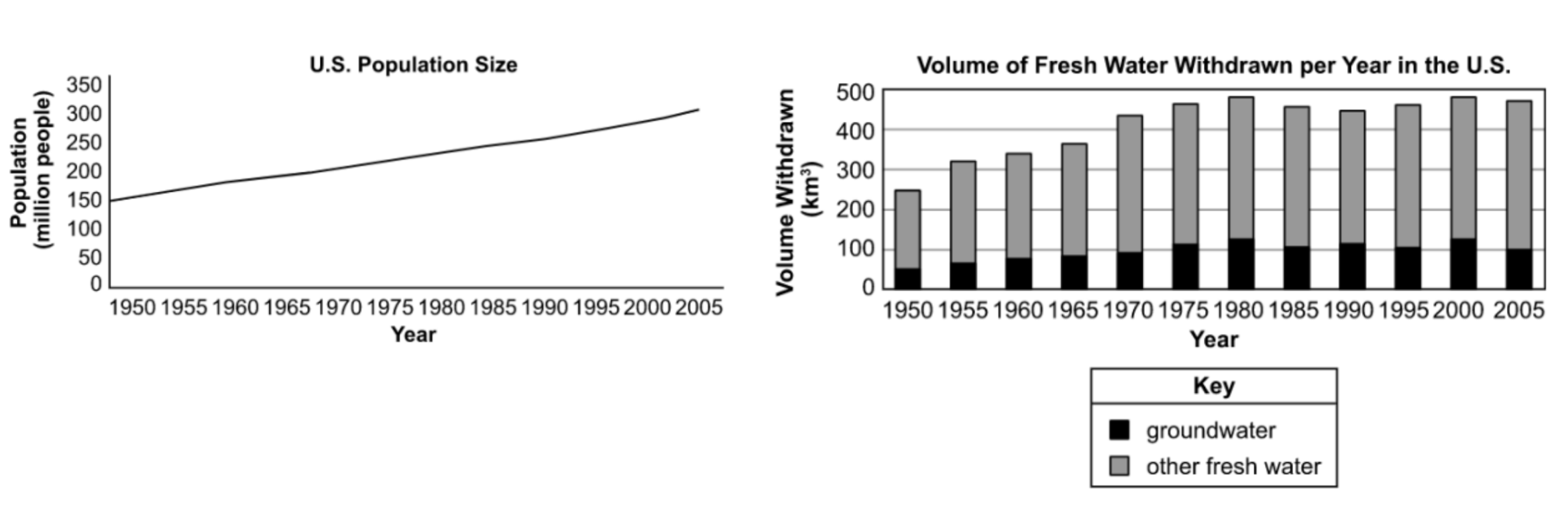 The two graphs below show the population growth and the usage of fresh water in the United States.