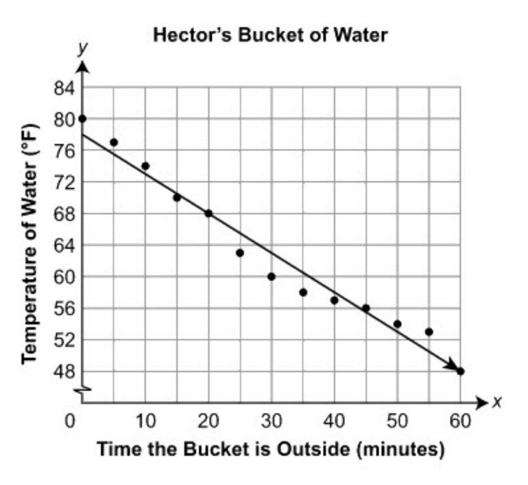 Hector puts a bucket of warm water outside on a very cold day. He records the temperature, in degrees Fahrenheit (Β°πΉ), of the water every 5 minutes for an hour. He plots his data and a line to fit his data on the coordinate plane.
