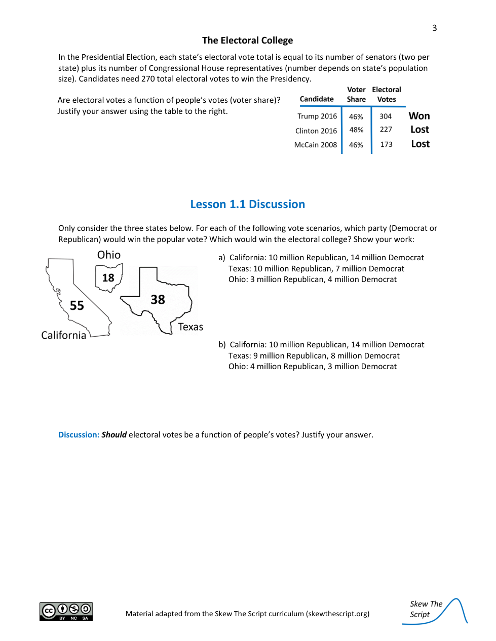 Lesson 1.1 Discussion: Only consider the three states below. For each of the following vote scenarios, which party (Democrat or Republican) would win the popular vote? Which would win the electoral college? Show your work: